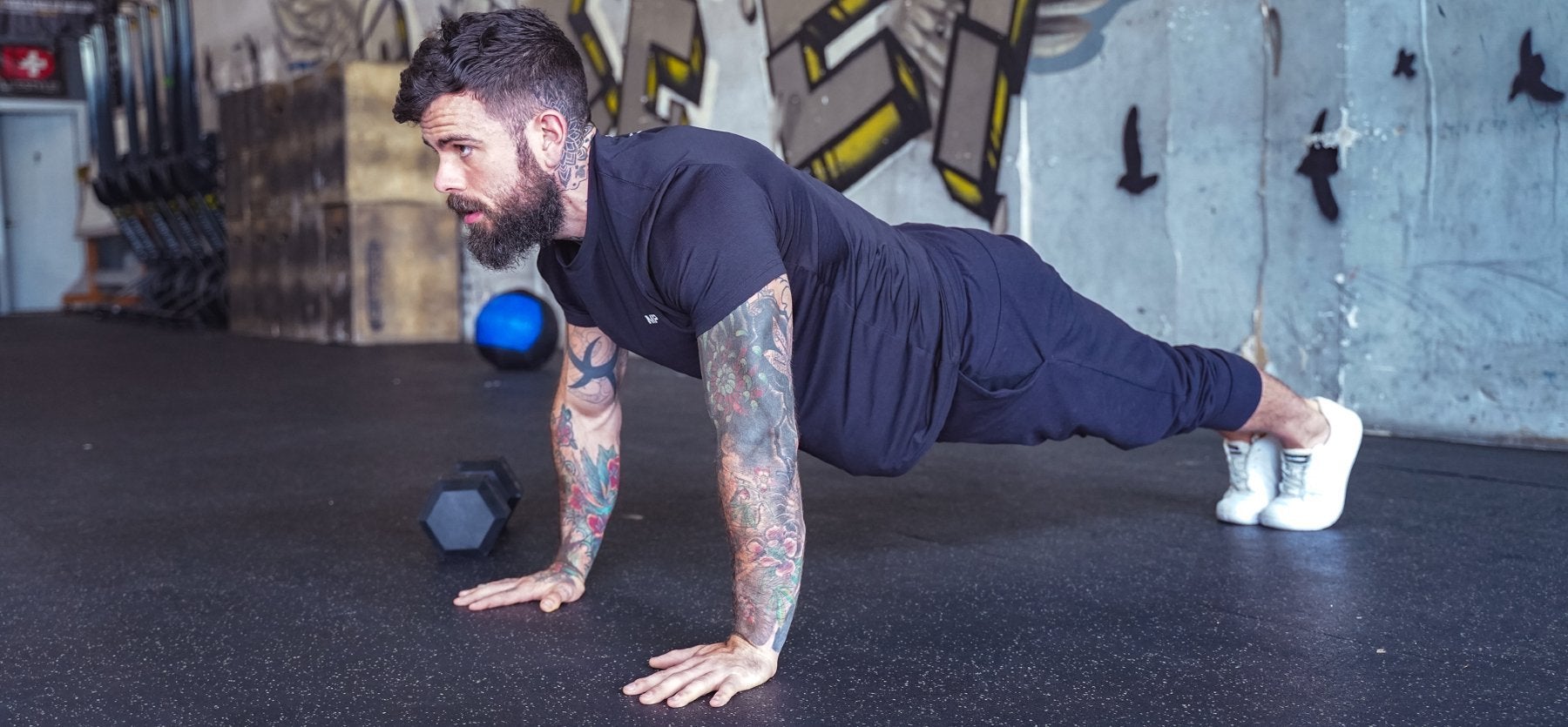Mettez-vous en position de planche et commencez votre pompe, vous pouvez faire une pompe à genoux si vous avez du mal à effectuer une pompe complète. Une fois que votre poitrine et vos hanches sont en contact avec le sol, arrêtez-vous avant de repartir.