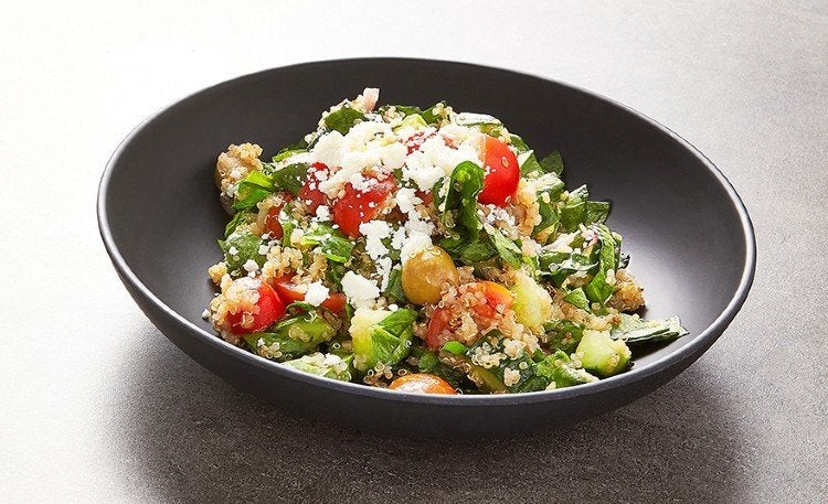- Ensuite, dans un grand bol, ajoutez le quinoa cuit, les jeunes épinards, les tomates cerises, l'avocat, l'oignon rouge, le concombre et les olives vertes. Utilisez une paire de cuillères à salade pour mélanger tous les ingrédients.