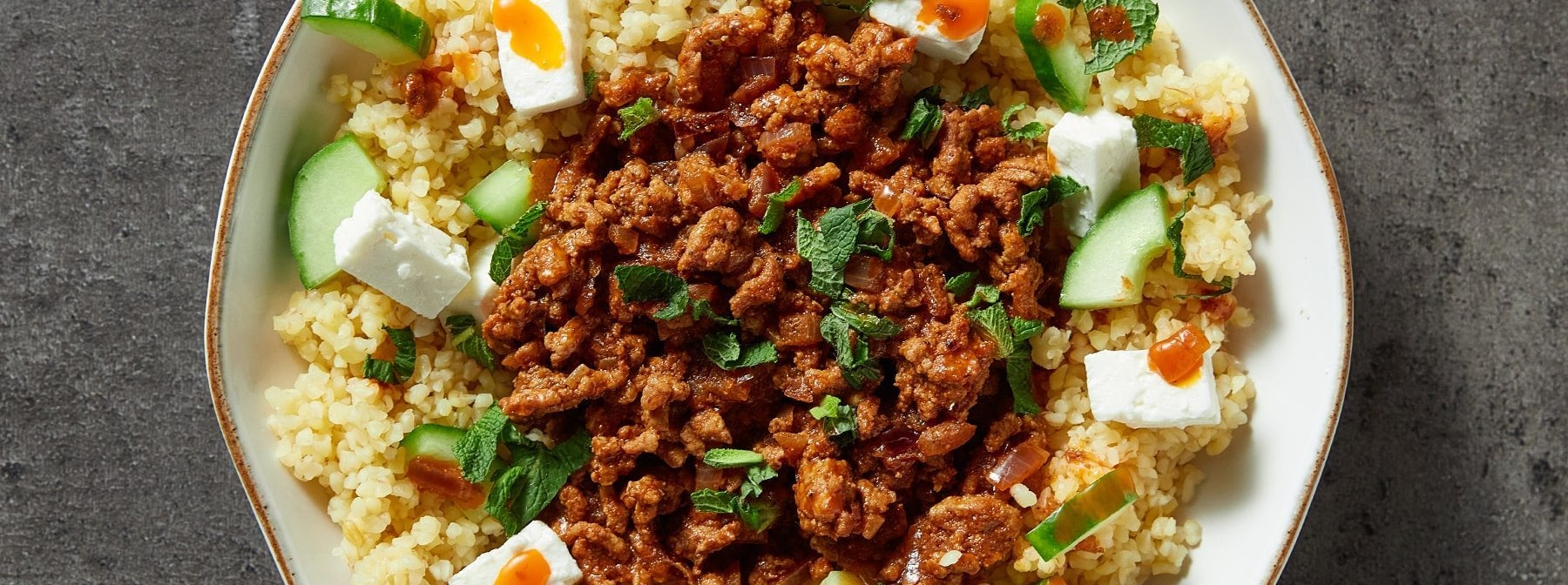 - Dressez un lit de boulgour à la feta sur une assiette et ajoutez quelques cuillerées du mélange d'agneau sur le dessus. Décorez de quelques feuilles de menthe fraîche et servez ! Vous pouvez également préparer des portions dans des récipients de préparation de repas et les conserver au réfrigérateur jusqu'à 3 jours.