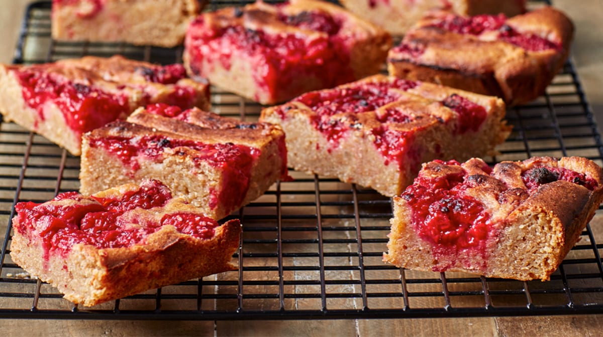 6. Passez les framboises restantes au micro-ondes pendant 30 secondes jusqu'à ce qu'elles libèrent leur jus puis à l'aide d'une cuillère disposez les framboises entières au dessus de la préparation à blondies. Utilisez un pic à cocktail pour réaliser des motifs en tourbillon sur le dessus.