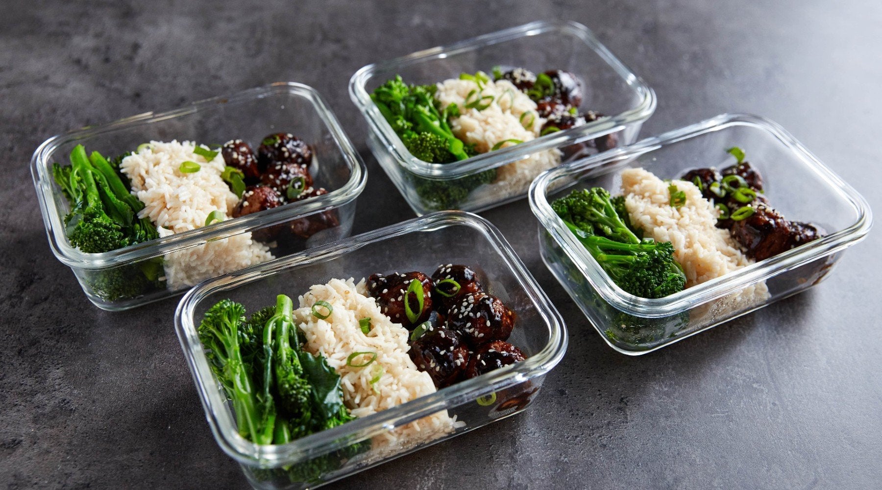 - Dans quatre récipients de préparation de repas, ajoutez le brocoli, le riz et une portion de boulettes de viande. Garnir de graines de sésame et d'oignons de printemps hachés.