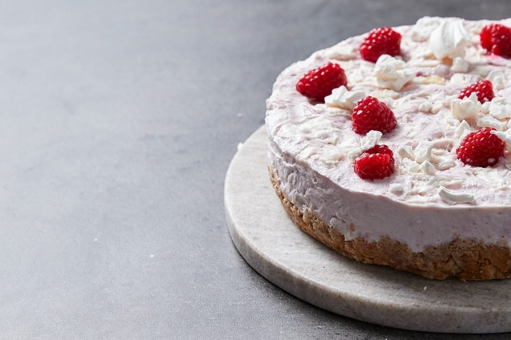 - Utilisez une spatule pour lisser la garniture de cheesecake uniformément sur la base, puis émiettez une des meringues sur le dessus. Placez les framboises restantes sur le dessus, puis congelez pendant au moins 4 heures (de préférence toute la nuit).