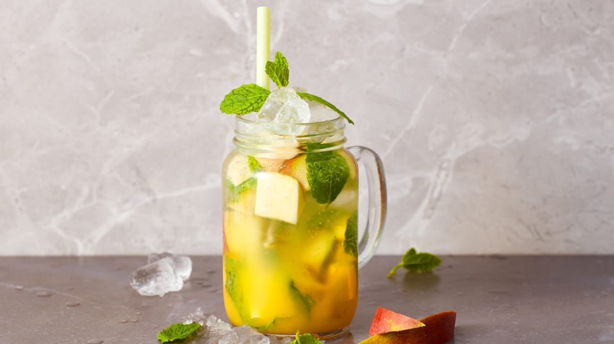 ? 1 scoop de BCAA (saveur pêche et mangue).? Une dizaine feuilles de menthe fraîche.? 1/4 de mangue (coupée en morceaux).? 1/2 citron vert (coupé en 4 tranches).? Une grosse poignée de glace pilée.? De l'eau pétillante.