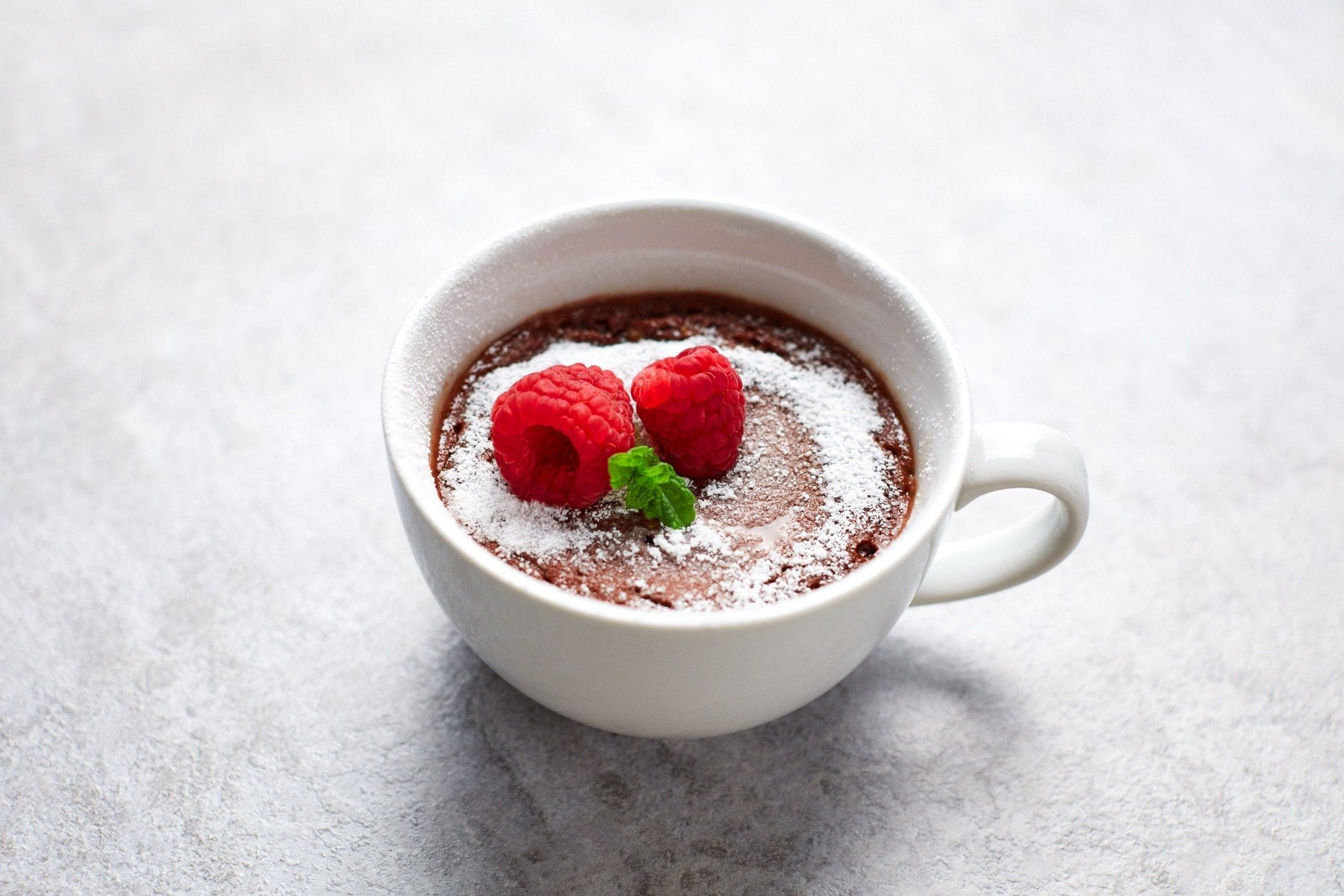 - Retirez du micro‐ondes et laissez refroidir pendant au moins deux minutes avant de manger. Faites attention au centre liquide — le Mug Cake sera extrêmement chaud à l'intérieur ! Si vous voulez un petit extra, pourquoi pas comme nous, ajouter une pincée de sucre glace et quelques baies ?