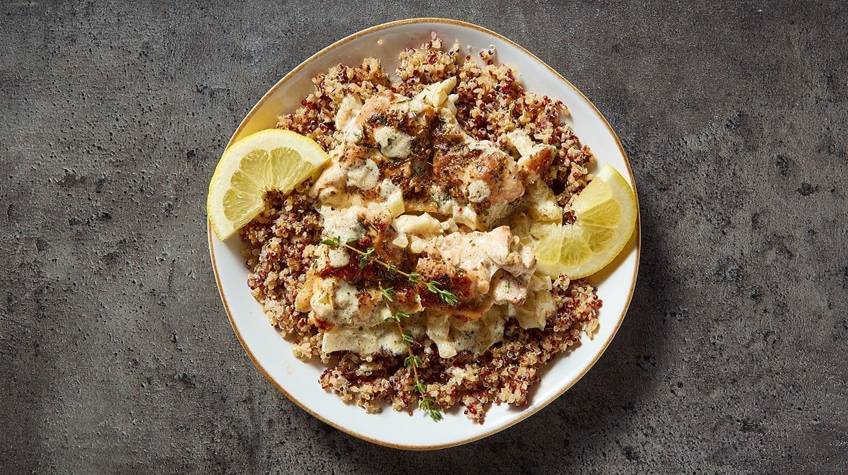 - Retirez du feu et garnissez de tranches de citron frais et d'un soupçon de thym. Servir avec du quinoa et déguster immédiatement ou en portions pour préparer vos repas de la semaine. Tout simplement délicieux.