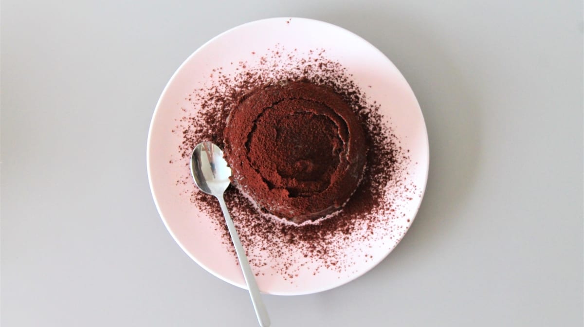 - Une fois cuite, renversez le bol sur une assiette, soupoudrez de poudre de cacao et dégustez.