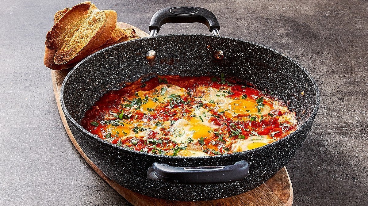 La shakshuka est un plat méditerranéen traditionnel composé d'œufs pochés dans une sauce à base de tomates, d'huile d'olive, de poivrons, d'oignon et d'ail. Nous pensons qu'il est un incontournable pour tous les repas de la journée – avec une tranche de pain croustillant au brunch ou avec une salade pour le dîner.
