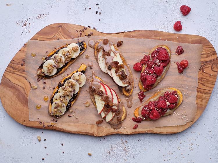 Alors préparez-vous à déguster de délicieux toasts croustillants à base de patates douces, garnis de pommes et de bananes, et agrémentés d'un délicieux beurre d'amande.