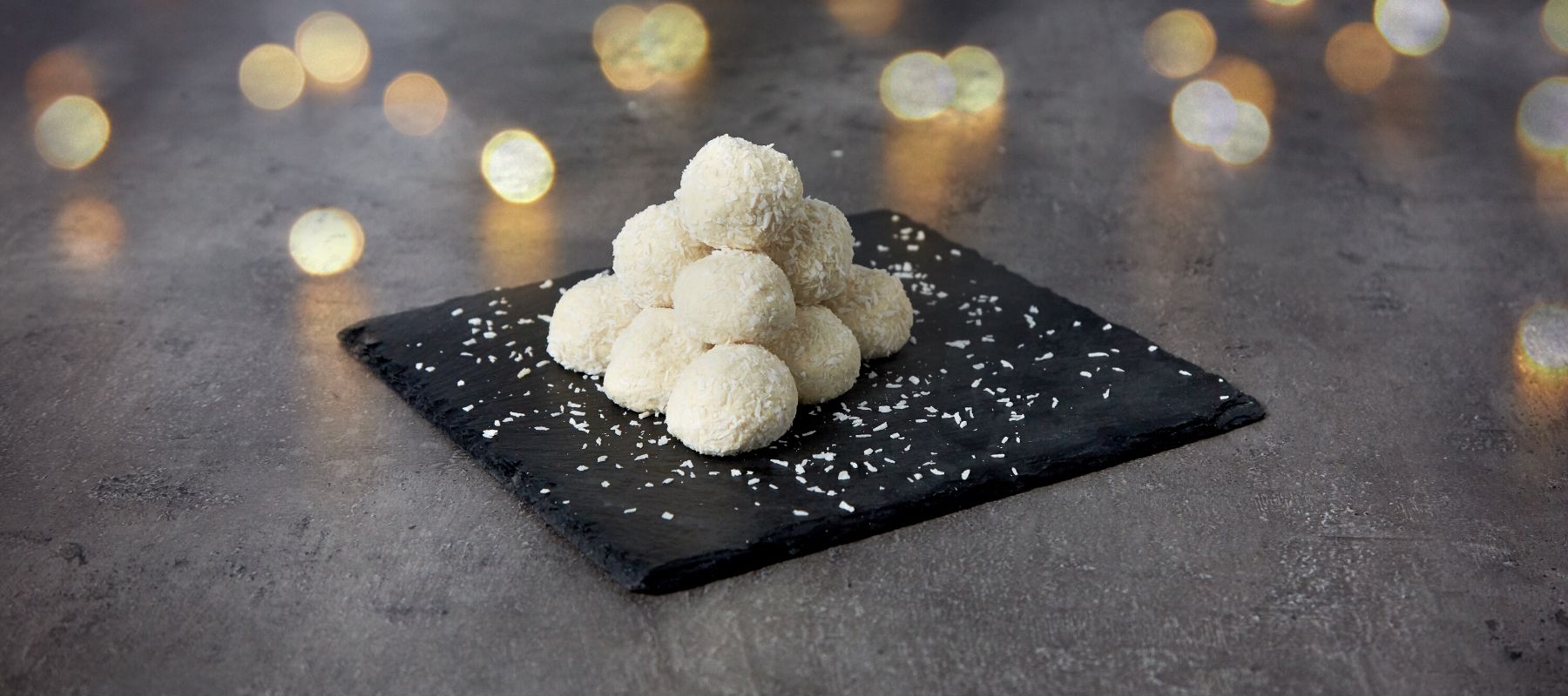 3) Rouler chaque bol autour d'un bol de noix de coco séchée, jusqu'à ce qu'il soit complètement enrobé.